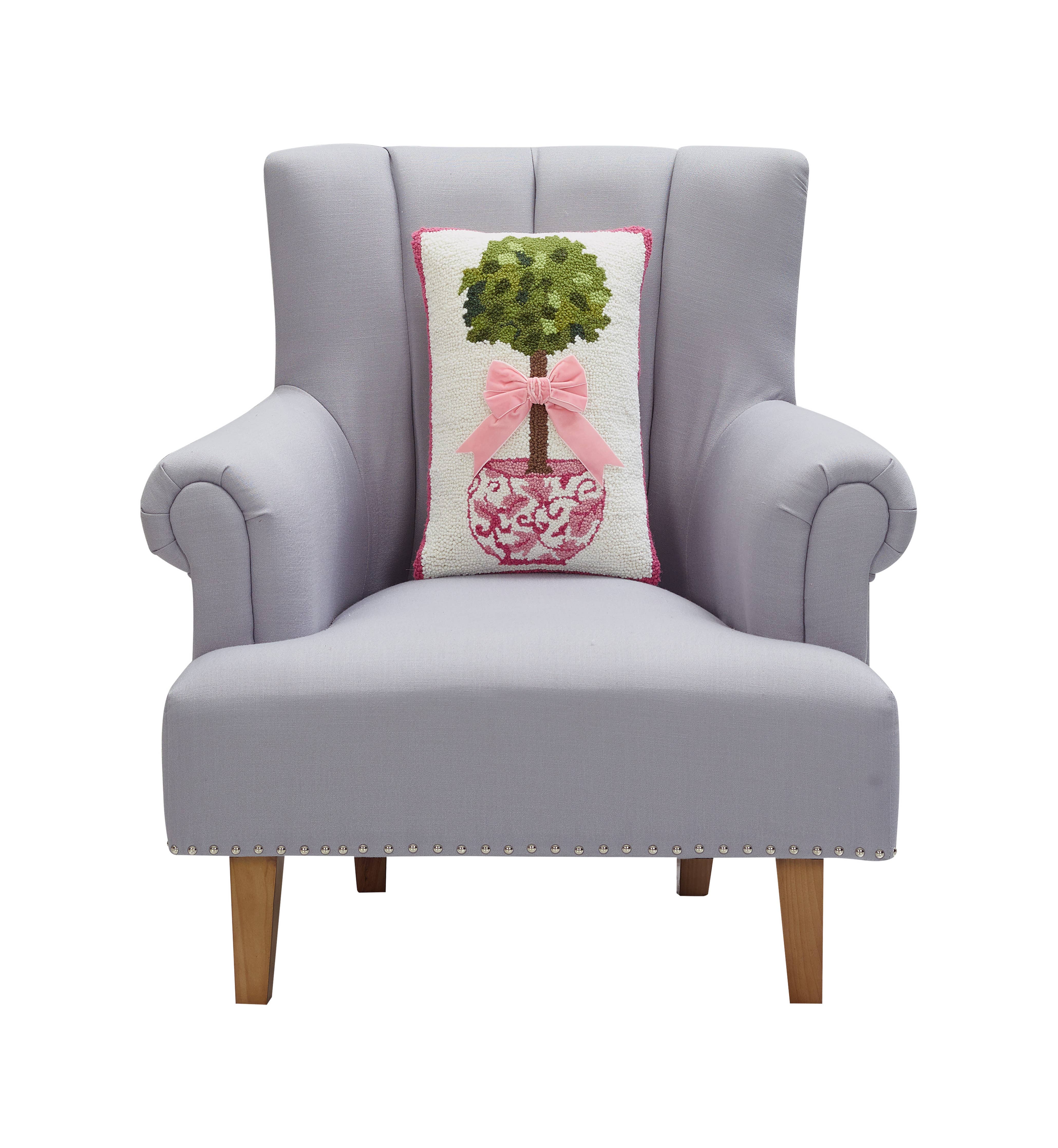 Elevate your space with this refined throw pillow, meticulously crafted from 100% wool hooked fabric paired with a luxurious 100% polyester velvet backing. Measuring 12x18 inches, it features an exquisite Chinoiserie topiary design adorned with delicate ribbon detailing. The pillow arrives with a plush polyester insert and convenient zipper closure for effortless maintenance and versatility in your décor.