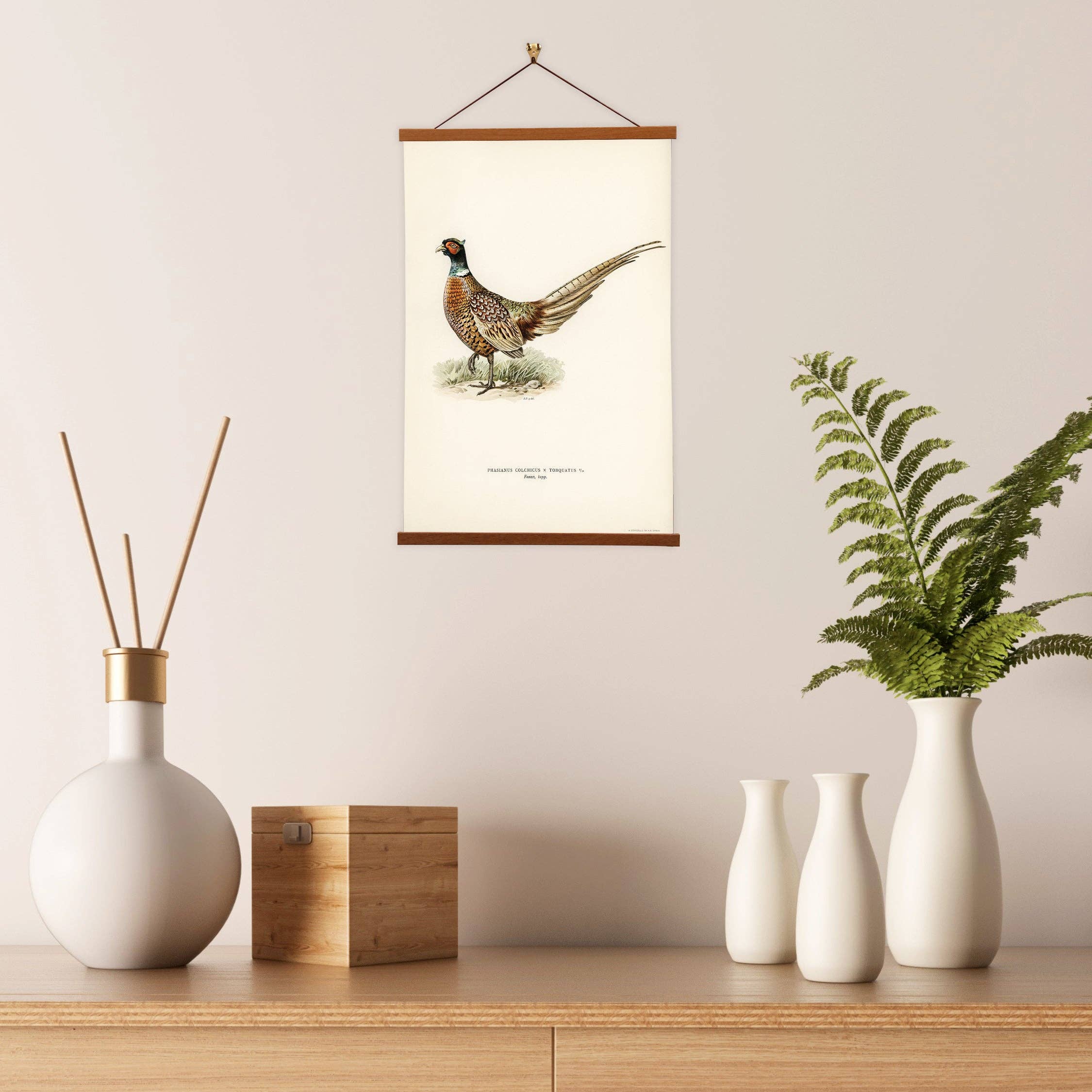 Display this striking Ring-necked Pheasant artwork with refined elegance. This 16" x 20" canvas print showcases meticulous detail through museum-quality digital reproduction on premium matte canvas. The heavyweight, luxurious material ensures lasting vibrancy and professional presentation. A walnut-toned magnetic wooden hanger with rustic rawhide accents provides a sophisticated mounting solution that complements any interior. The combination of fine art craftsmanship and thoughtful design transforms your wall into a gallery-worthy focal point.